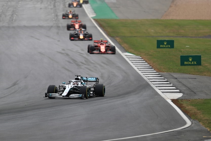 Hamilton gave the crowd something to cheer as he took the lead for all of two corners as Bottas fought back as the silver arrows battled over the lead of the British Grand Prix in the opening laps before the Brit dropped back a little to stay out of the dirty air of his team-mate.