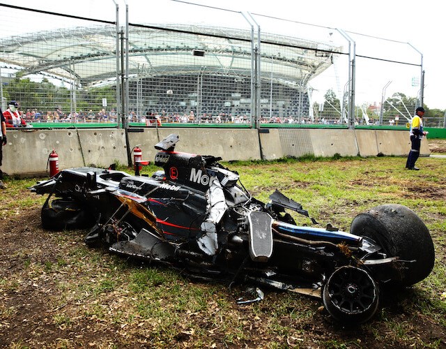 Alonso’s McLaren veered into the wall and went into a series of violent rolls before it flew through the gravel trap and slammed into another barrier disintegrating upon impact.
