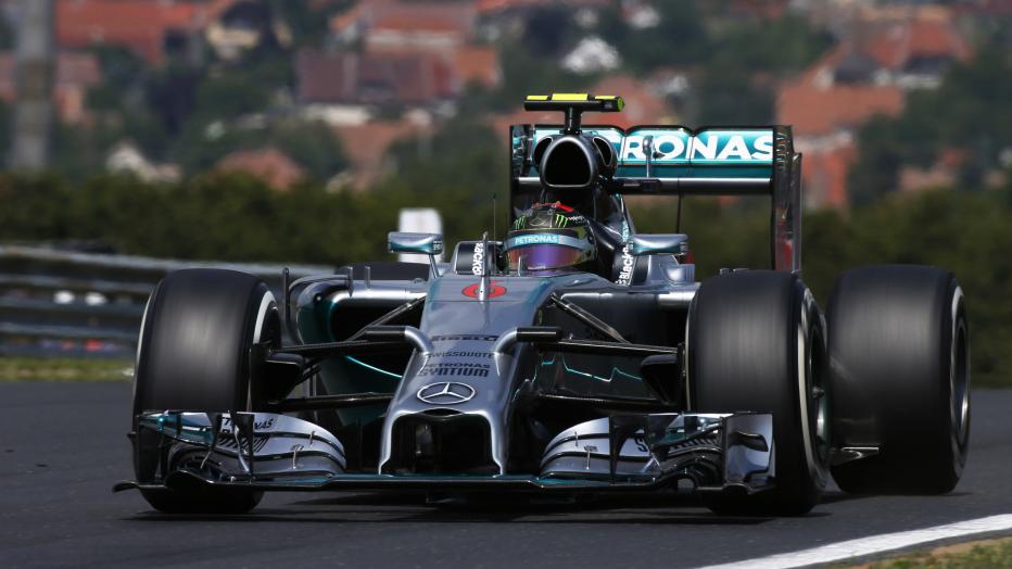Nico Rosberg will start the Hungarian GP from pole after an action packed Formula One qualifying session saw his rival Lewis Hamilton fail to set a qualifying time after suffering a spectacular fire.The Q1 session started with the astonishing sight of Hamilton coasting into the pit lane entry with the rear of his car well alight after what the team believes was a fuel leak, having not yet set a flying lap. It took some time to get the fire under control, and it seems inevitable that he will have to use the spare chassis rebuilt over night – which will mean a pit lane start.