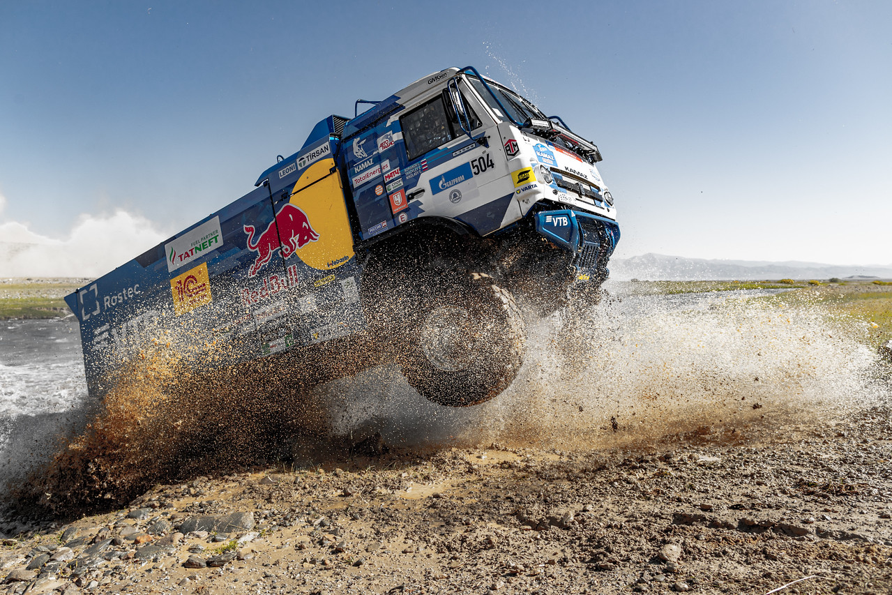Since the start in Omsk last Friday, the brand new KAMAZ MASTER K5 of Dmitry SOTNIKOV, Ruslan AKHMADEEV and Ilgiz AKHMEZIANOV has been setting the pace in the truck category. And if their team-mate KARGINOV, yesterday’s winner, had hoped to beat them again today, a river crossing put paid to those ambitions. With a lead of nearly six minutes over Belarusian VIAZOVICH (MAZ) in the overall standings, it will be a question of finding the right balance between speed and caution tomorrow on the final stage of the SILK WAY RALLY.