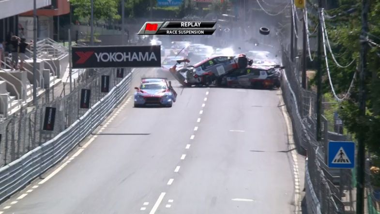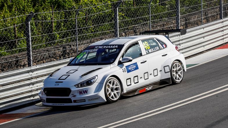 Muller bogged down from sixth on the grid at the first start and fell down the order, which turned out to be a blessing when the two front-row sitting Sébastien Loeb Racing Volkswagens of Rob Huff and Mehdi Bennani collided at Turn 2, with Bennani’s car launched into the air. The whole field behind began to pile into the accident, with Norbert Michelisz just managing to get past the accident but still suffered a hit on his BRC Racing Hyundai i30 N TCR.